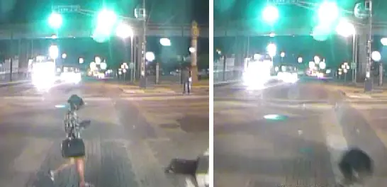 focussed on her phone. The right panel, taken a moment later, shows that with the bus only a few feet away, she still kept attention downward toward the phone and did not look up. She did not sense a bus-sized object coming toward her a few feet away. Note also that the green lights face the bus, so the pedestrian was not only distracted but was also crossing against a red traffic light.