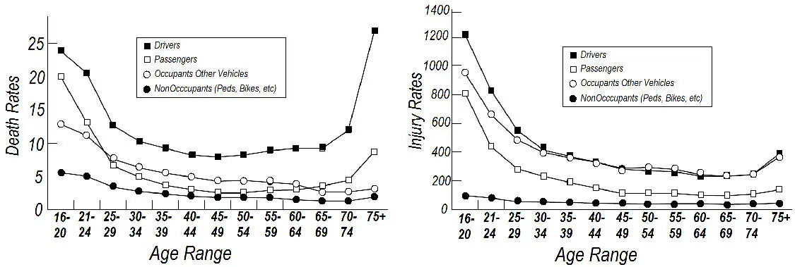 Figure 1 Deaths (left) and injuries (right) per 100,000 drivers of various age groups. (After Braver & Trempel, 2004)