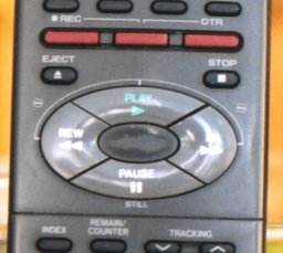 This is the remote for my old Mitsubishi VCR. The major controls are located in a ring. The "stop" button is a tiny dot in the upper right. Naturally, I push "pause" when I mean "stop" much of the time. I also confuse the "eject" and "stop" buttons because their locations are completely arbitrary much like the positions of the hallway light switches. The design is flawed for several reasons. People think of actions in pairs—stop is the opposite of start, so that's where it should be located. Further, the most commonly used controls should be largest and easiest to find. "Stop" is hard to find and hard to push because of its size. This is especially important for TV and VCR controls because people do not typically look at them, relying instead on felt position. (The subsequent Mitsubishi model properly reverses the positions of "stop" and "pause" buttons.)