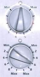 I recently burned dinner and destroyed a pan because I set the heat to high rather than to medium. The cause is the stove's badly designed controls. The picture shows two of the four controls on my fancy new stove. Three of the four burner controls are similar to the top one shown in the picture. The "Min" position is at about eleven o'clock and the "Max" is at about one. To set the burner on medium heat, for example, you turn the arrow to point down, somewhere around 6 o'clock. The lower control is the oddball. Note that it has two sets of Min and Max markings. This is a fancy burner that has both a small and a large heating element, and the more complicated control does double duty, letting you set either. The two markings on the left refer to the smaller diameter heating element while the two on the right a larger one. Most important, turning the arrow downward is likely to set the burner to MAX, not medium as on the other burners. That's exactly what I did. Wanting a medium setting, I merely flipped the arrow downward as I do on all the other controls.